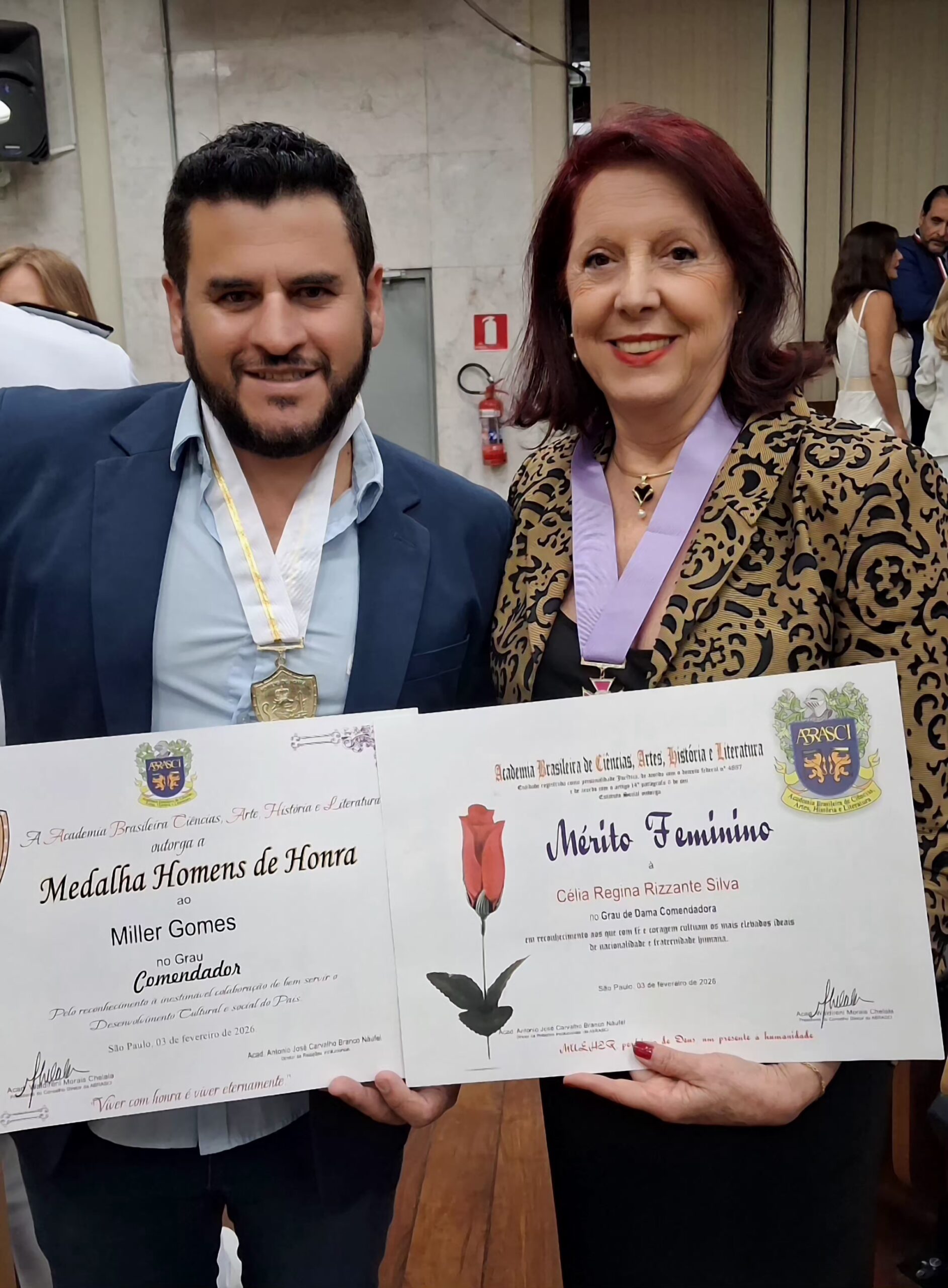 SÃO PAULO, SP – Em uma cerimônia solene realizada no último dia 03 de fevereiro, na Câmara Municipal de São Paulo, o empresário e comunicador Miller Gomes foi condecorado pela Academia ABRASC com o Certificado de Honra e a Medalha de Comenda. A honraria é um reconhecimento oficial ao seu relevante trabalho filantrópico e ao impacto social gerado pela fundação da CAV (Casa de Apoio à Vida).